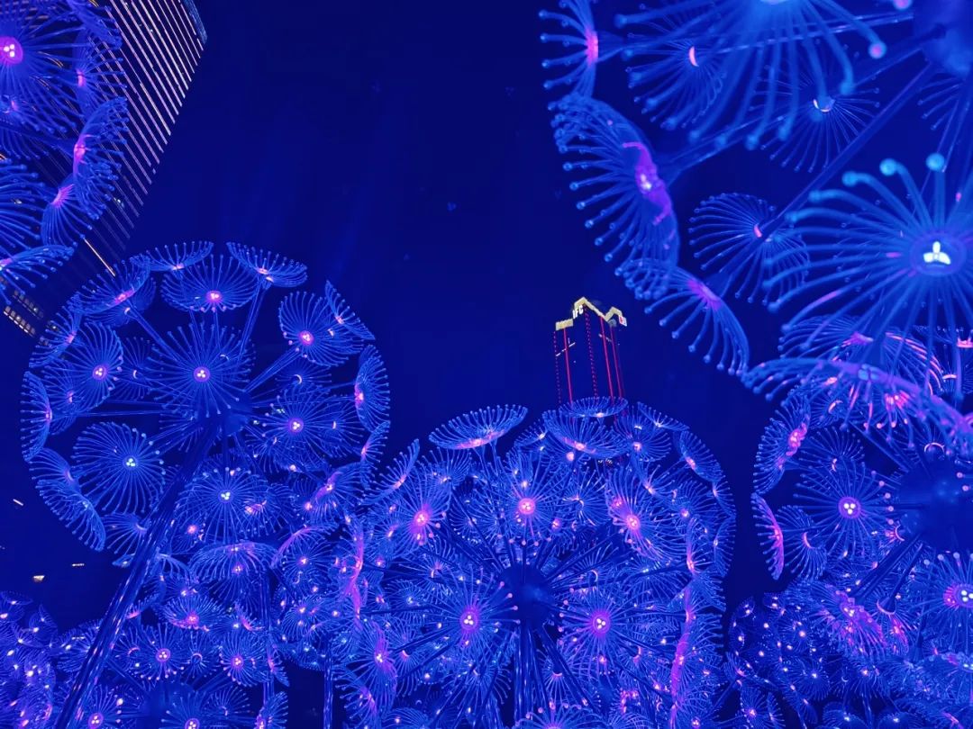 在橫琴金融島中央公園,40支高度為2.5米、直徑為0.6米的蒲公英燈飾如同希望的使者,散發著明亮而溫暖的光芒,為夜幕下的公園增添了一份璀璨的光彩。