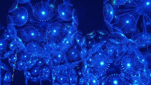 夜晚,當游人經過,在喇叭裝置處說出“熱烈慶祝中華人民共和國成立75周年”、“熱烈慶祝澳門回歸祖國25周年”等祝福語時,花朵會自動打開并亮燈,創造出驚喜的互動體驗。
