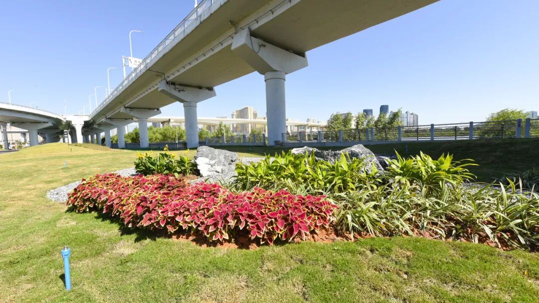 項(xiàng)目整體以微地形草皮為主,搭配栽植灌叢、樹(shù)叢、花地,巧妙地點(diǎn)綴著園林小品,視覺(jué)上有擋有敞、有疏有密、高低起伏。此外,在部分區(qū)域還精心鋪設(shè)了游憩步道,在步道兩側(cè)及綠地之中,設(shè)置木椅,供行人休息。